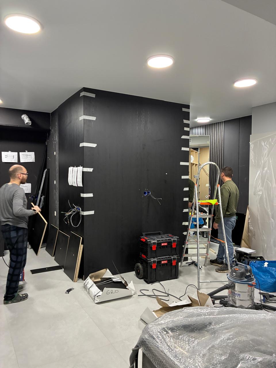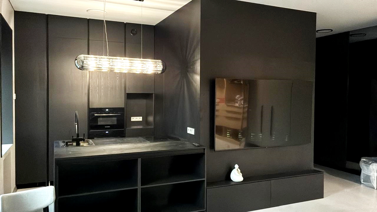 Кухня с островом на ручке Gola+ стеновые панели с запилом под 45 °. Все выполнено из ЛМДФ EGGER Черный лес.