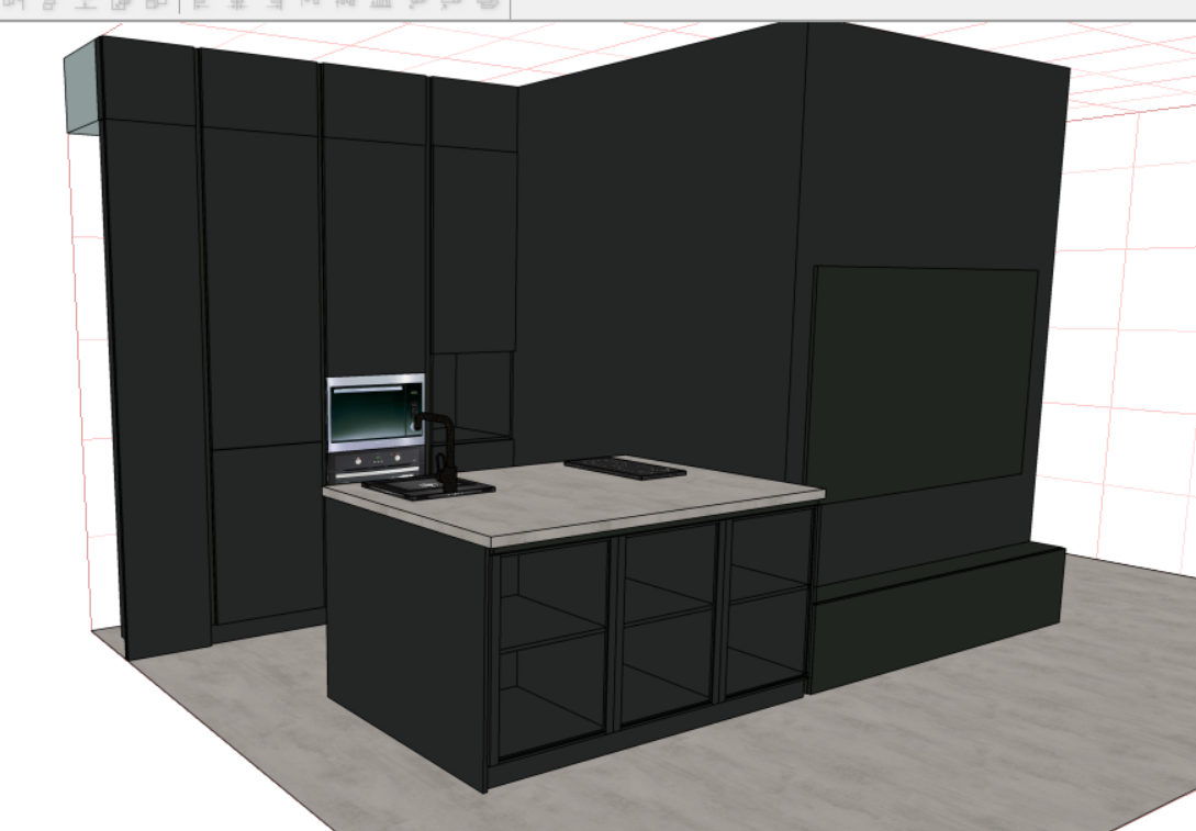 - На острове внешние фасады выполнены из черной алюминиевой рамки и акустической сетки.
