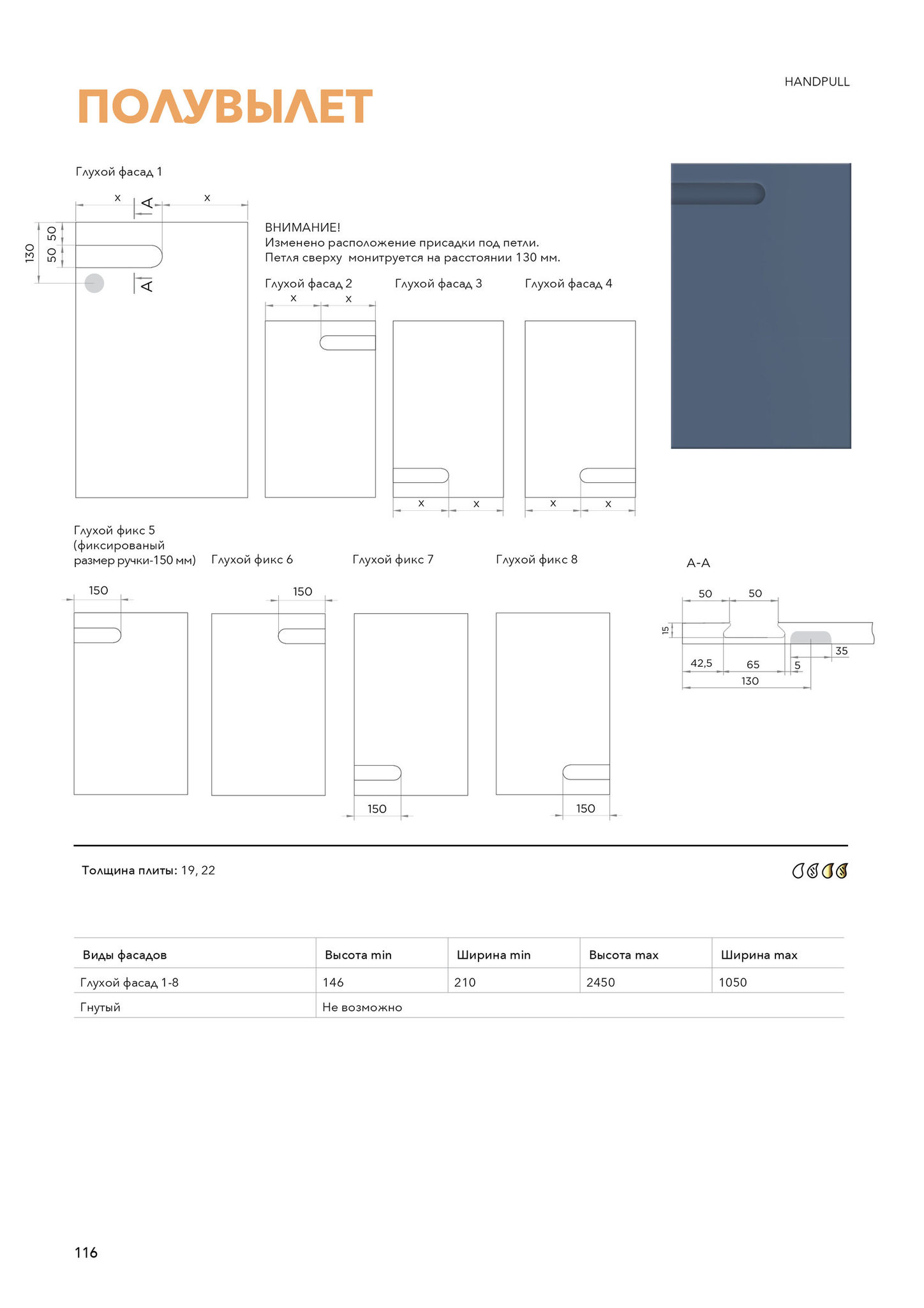 Фрезеровка "Полувылет" c фрезерованной ручкой Handpull.Толщина плиты: 19 мм, 22 мм.Минимальные размеры глухого фасада: 146 ×210 мм.